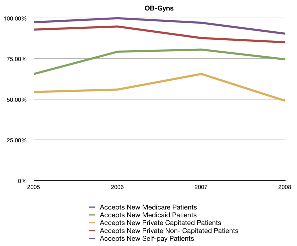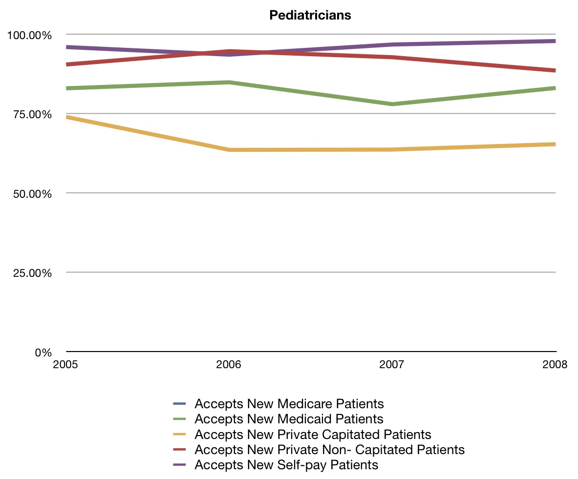 Now obviously there’s no Medicare line, as these are kids. But notice the Medicaid line? Not much change overall from 2005-2008. Here’s the shocker, though. The acceptance of Medicaid is much closer to that of private non-capitated patients, and much better than that of private capitated plans. Acceptance rates of patients with those plans dropped off pretty severely between 2005 and 2008.