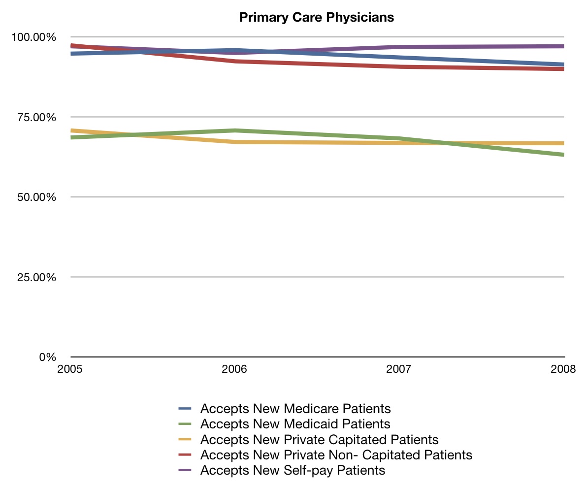 What should we note here? First that the difference in the rates of acceptance of new patients with Medicare, private non-capitated patients, and self-pay patients are pretty similar. If you want to get detailed, however, the acceptance rate of private non-capitated patients went down more than the other two groups. Second, Medicaid acceptance rates were lower. They were comparable, however, to the acceptance rate of patients in private capitated plans. Also, not much changed from 2005-2008.