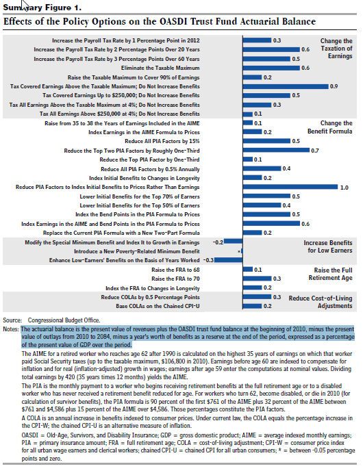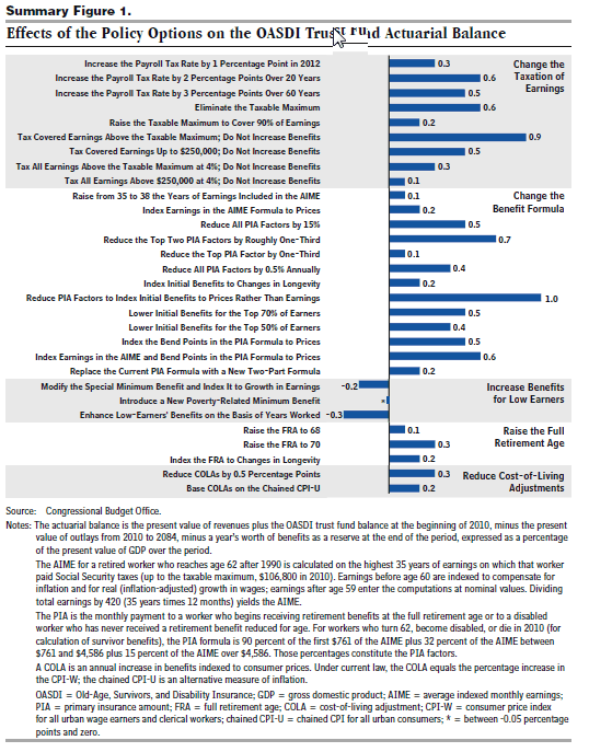 Several people have written asking about specific Social Security tweaks and the relative magnitude of the ‘fix’ provided by them (yesterday’s post; earlier today). Below is a summary table from the July 2010 CBO report on Social Security reform options. The benefit of this report is that it shows different options (increase tax rate, increase wage to which the rate is applied, different ways to cut benefits, either directly or by indexing benefits, etc.) each run one at a time. Summary Figure 1, from page XI of the report provides a useful overview of the different options and their relative effect on the actuarial balance of the OASDI trust fund balance, defined as follows: “present value of revenues plus the OASDI trust fund balance at the beginning of 2010, minus the present value of outlays from 2010-2084, minus a year’s worth of benefits as a reserve in 2085, expressed as a percentage of the present value of GDP from 2010-84.”