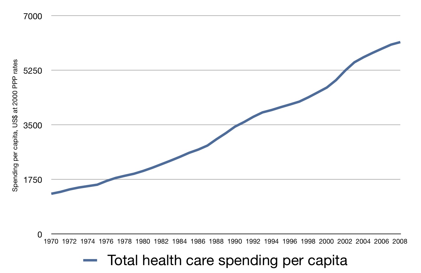 After I posted the chart yesterday with health care spending as a percentage of GDP over the last few decades, a number of people asked how much changes seen were due to GDP and not health care costs. So let’s take GDP out of it. Here is US health care spending per capita over the same time period (OECD data):