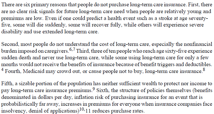 I wrote a paper in Health Affairs (I believe ungated here via NIH depository) with colleagues from Duke and Boston University that was in the January 2010 Health Affairs that looked at the viability of using genetic markers as risk adjustors for private LTC insurance. I don’t want to focus on the genetic piece, but the reasons people don’t purchase private LTC insurance: