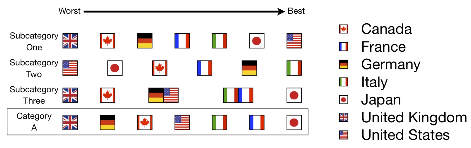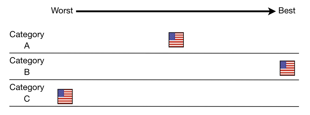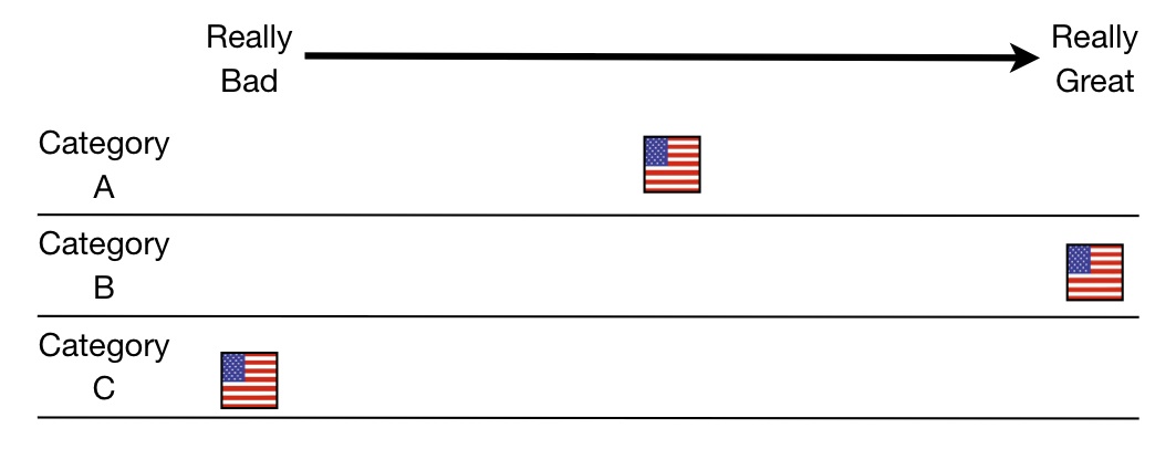 In this example, the US was the best in Subcategory One compared to the other countries. For Subcategory Two, data were only available for six countries, and among those, it was the worst. Please don’t post a comment to complain that the UK might be hiding data. I am not saying the US is worse than the UK in Subcategory Two. I’m saying it was the worst compared to the other countries. For Subcategory Three, the US tied with Germany for fourth. When I’m showing data over a number of years, I will be averaging over those years unless I say otherwise.
