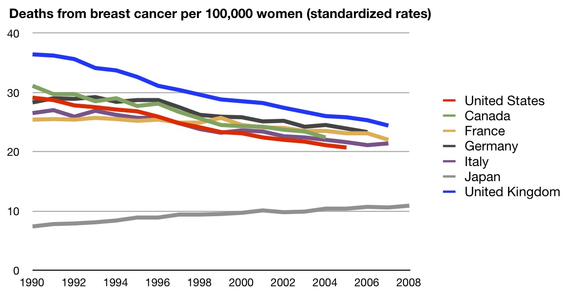 Well, the good news is that we are among the best in the world when it comes to breast cancer mortality. We’re not the best, but we’ve been #2 in the G8 for a while. Japan however, seems to be doing much, much better than we are.