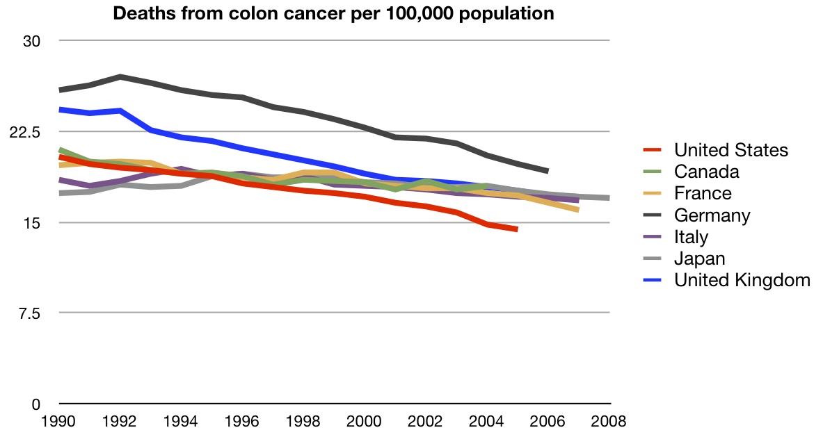We are very good in treating colon cancer, with the lowest mortality rates when compared to comparable countries. A solid win for he US.