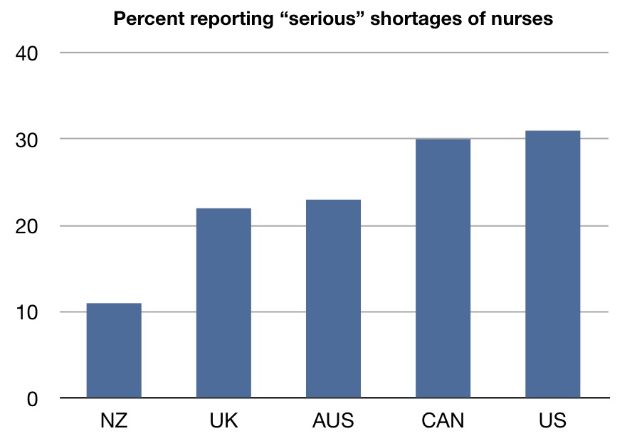 You may remember from a previous post that we have hard numbers on how many nurses we have per population. But, subjectively, more hospital executives in the United States think there is a “serious” shortage of nurses than in the other countries surveyed. How about physician specialists: