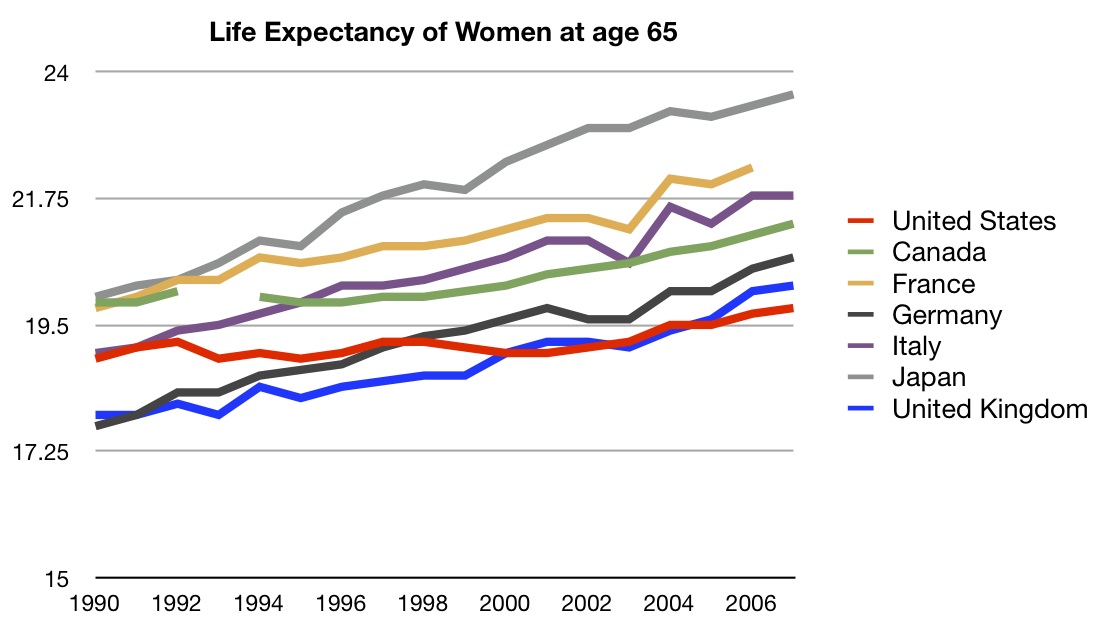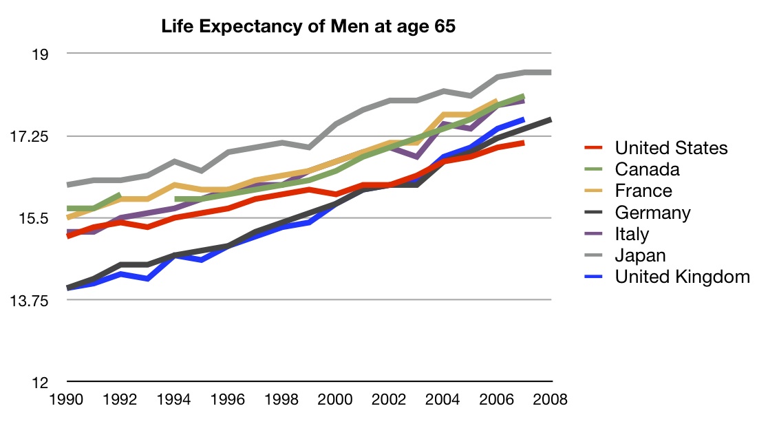 So let’s look at the life expectancy for 65 year olds. According to the people who did the analysis for AEI, that’s the fairest way to assess life expectancy as a health care system population metric.