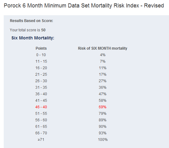 For example, I used the Porock score which provides a prediction of 6 month mortality risk of institutionalized persons and is often used to inform hospice eligibility decisions, entered information for a fictitious patient and it returned the following: