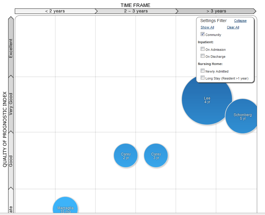 Even more interesting, this team of colleagues from UCSF has developed an on-line tool, ePrognosis that provides a simple way to enter patient information into 16 predictive tools and receive a predicted life span based on the entered characteristics. The entry portal on the web site provides a list of different indices arrayed by time frame of the assessment tool, and the quality of the tool as assessed in the paper published in JAMA. Shown below are the community based mortality indices available; 16 different indices are available, some based on transitions such as hospitalization or nursing home admission. The size of the bubbles are driven by how often each index is used on ePrognosis, as well as by the degree to which users rated the tool as useful.