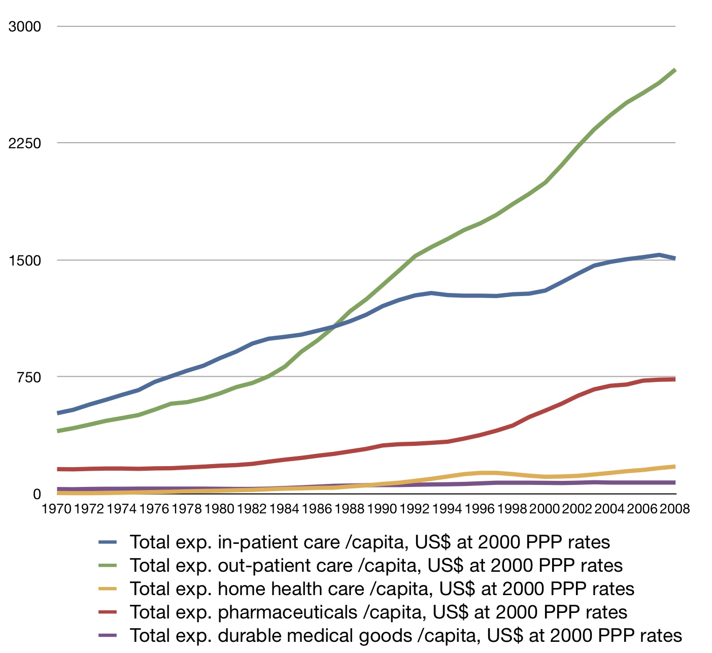 Cost chart week continues. I’ve posted graphs with outpatient and inpatient care, but people want more. So here are more data on how US spending has changed in a number of areas over the last few decades (all in US$ at 2000 PPP rates):