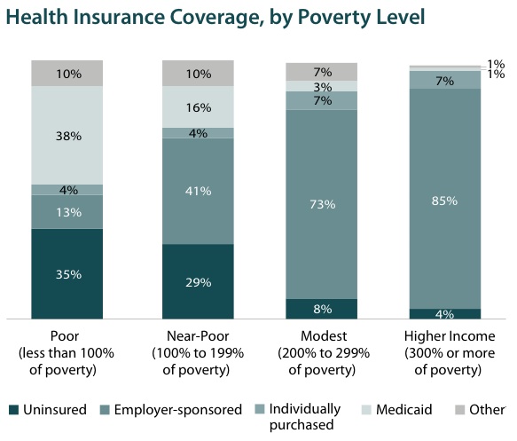 There’s a meme out there that the poor are well covered by Medicaid. I want you to notice, though, the percent of women who are uninsured. Almost 30% of women who are near poor and 35% of women making less than the poverty line are uninsured. Also note that only 38% of women who make less than the poverty line are on Medicaid. Only 16% of women who are near-poor are on Medicaid.
