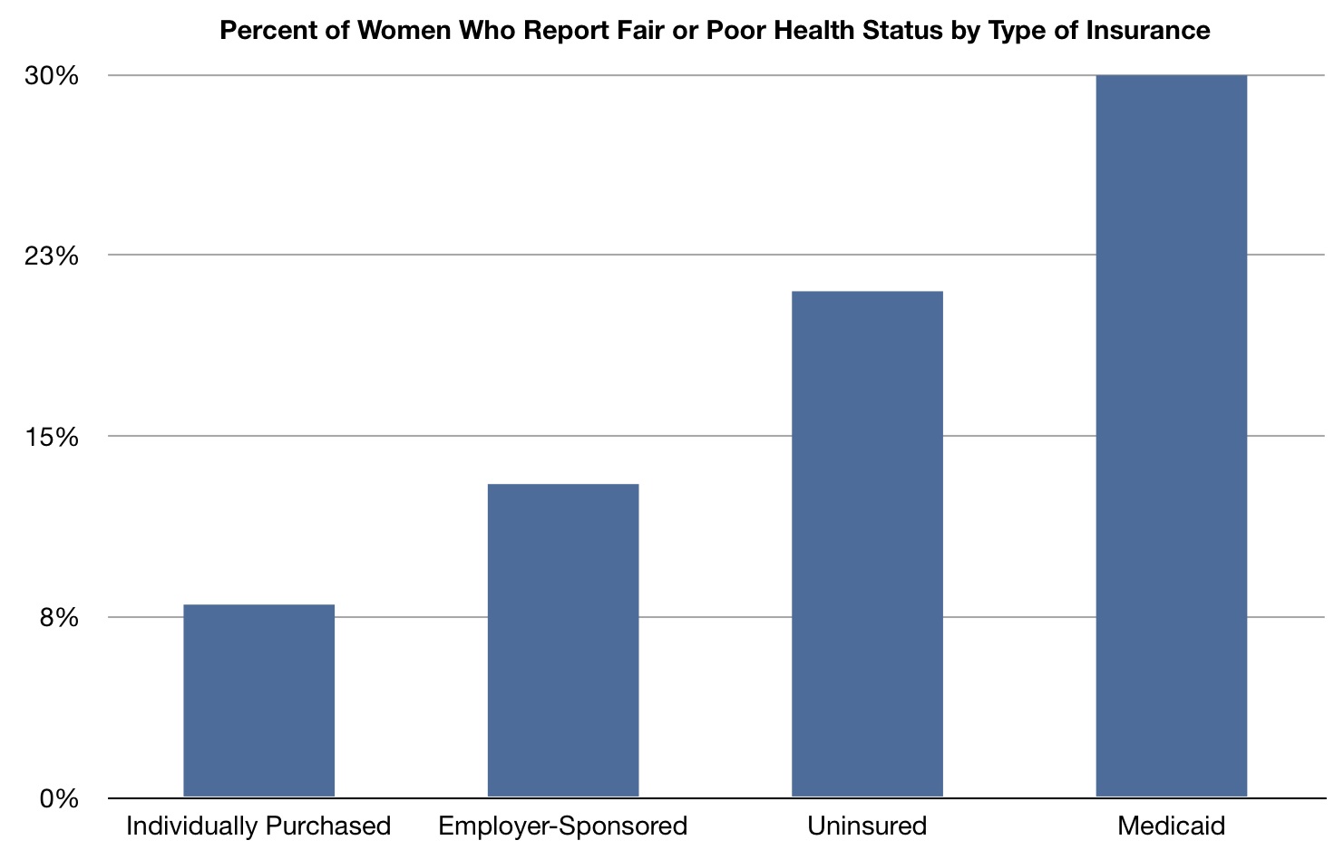 This is the percent of women who report their health status as “fair” or “poor”. What I want you to see is how much adverse selection is already affecting the health insurance market. Most of the people who get insurance in the individual market are not in fair or poor health. Much of that is because if you’re sick, you can’t get a policy. That’s what guaranteed issue is supposed to fix. I also want you to note how relatively healthy the employer-sponsored insurance market is.