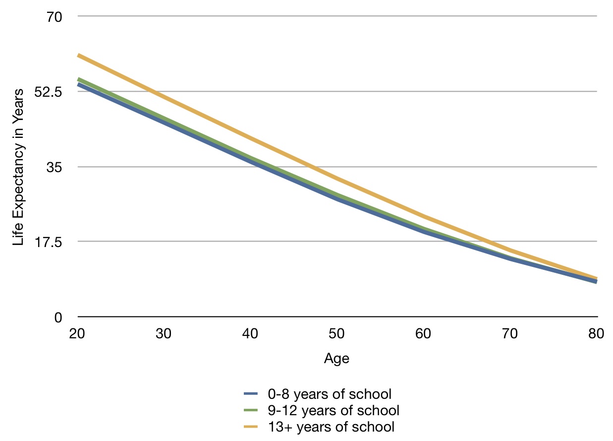 Let’s start with some US-only data, though. A chapter at the end deals with the effect of inequality on life expectancy. Here, for instance, is a chart I made from data on the relationship between years of education and life expectancy at various ages by the end of the 1990’s: