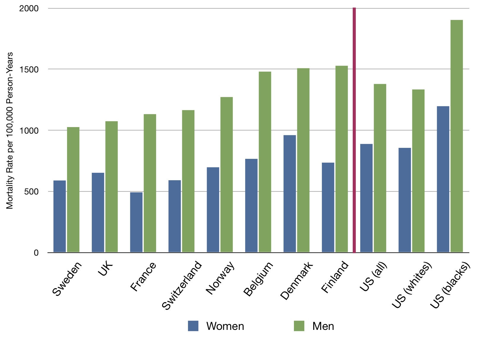 This final chart depicts the mortality rates for people 30-74 in a number of countries standardized to the US Census population in 1995, for both men and women. To the right of the red line are the US (overall), then US whites, then US blacks: