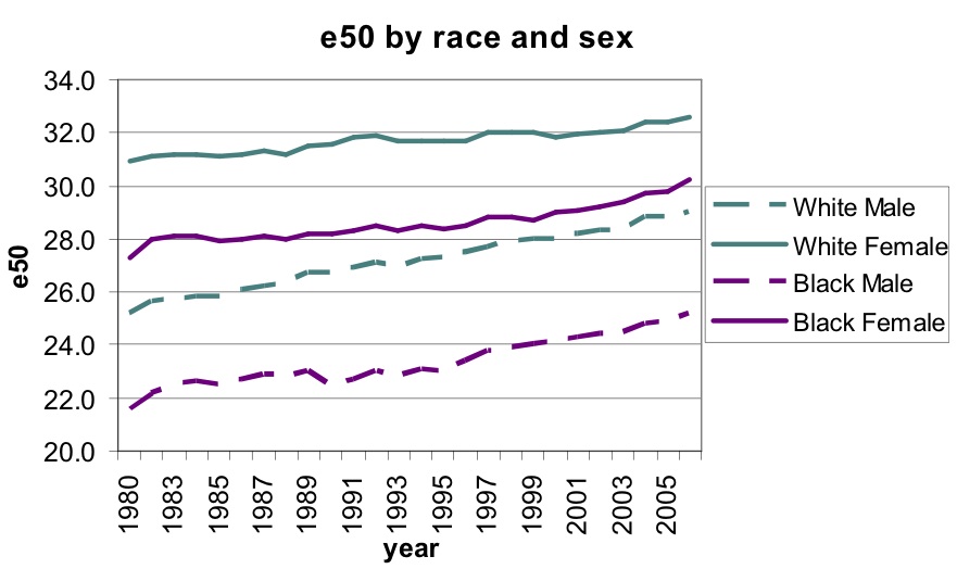 Another chart deals with differences in life expectancy at the age of 50 by race over time: