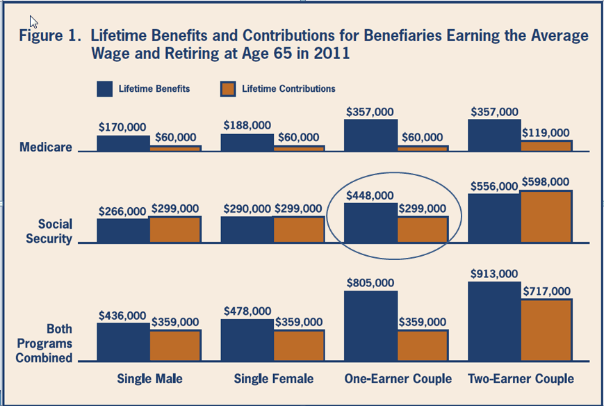 Gene Steurle and Stephanie Rennane have a nice policy brief put out by the National Institute for Health Care Management on the lifetime contributions and benefits of Social Security and Medicare. This is mostly familiar stuff, with lifetime Medicare benefits consistently being several times larger than contributions to the pay-as-you-go program, and Social Security lifetime contributions and benefits being more similar for singles and two-earner couples. However, one thing jumped out from this figure (circled):
