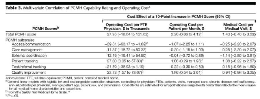 It is critical to understand the cost of the PCMH from the perspective of individual clinics. Such cost data are essential for practices to make informed decisions to adopt the PCMH and for policy makers and administrators to design financially sustainable medical home models. Most PCMH cost studies have focused on potential savings from reducing hospitalizations and emergency department visits. Although those are important cost outcomes, the savings accrue to payers and rarely affect the finances of the primary care provider. The majority of US primary care physicians do not benefit financially from prevented hospitalizations or emergency department visits. (emphasis added)