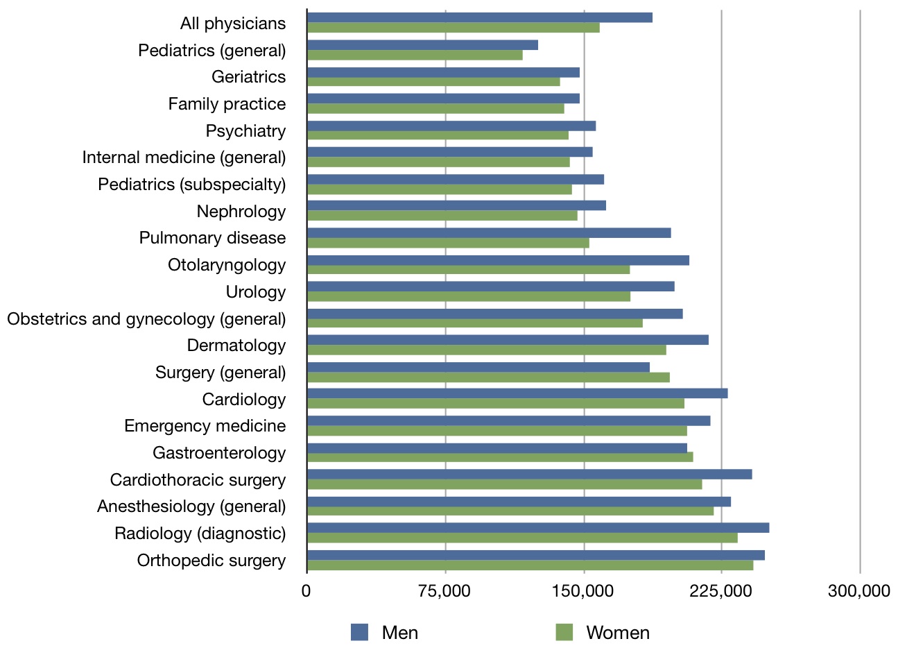 First, let’s look at the unadjusted analyses. Here are starting salaries, for men and women, in selected physician specialties (I made the chart with their data):