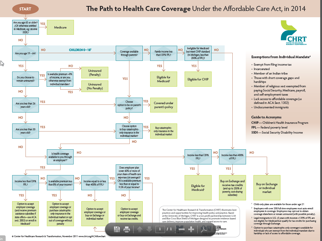The Center for Health Research and Transformation (CHRT) has a chart that is making the rounds showing how people will get health insurance in 2014 if the ACA is implemented :