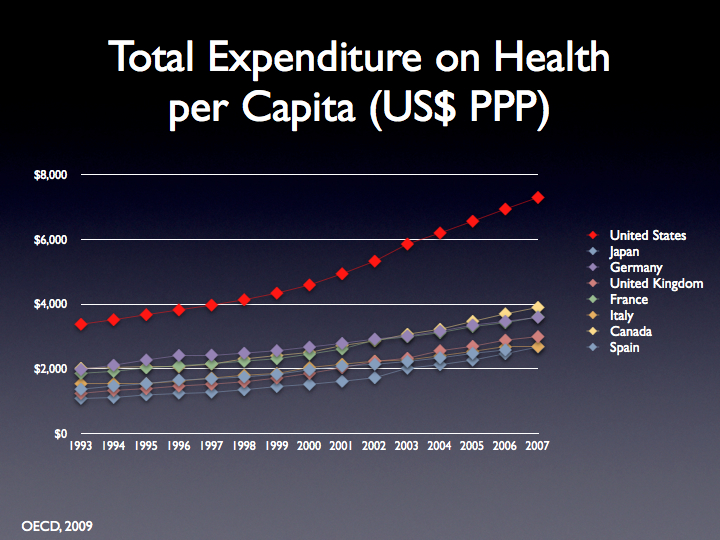 That’s the cost, per person, for health care in eight of the ten richest countries in the world. That’s per person. In other words, that includes all the people with no insurance, all the people who have no access to the system. And still, we spend about two to three times what all these other countries spend per person on health care.