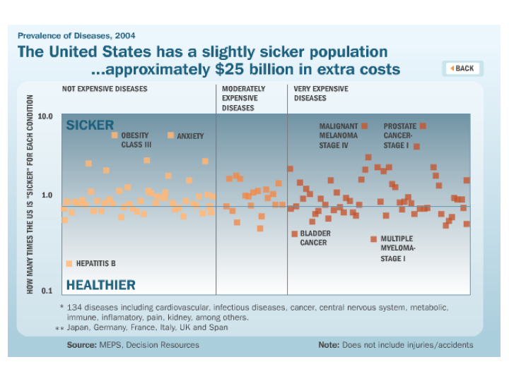 Let me orient you. Diseases which are more prevalent in the US relative to other countries are shown by points near the top. See Obesity there? It’s high, because we’re very obese. However, diseases that are more expensive to treat are towards the right. So, Multiple Myeloma is less common in the US and expensive. That should help out our overall costs. Hepatitis B is also much rarer in the US. But it’s not nearly as expensive to treat, so it doesn’t help us out much.