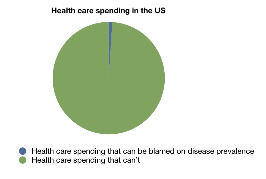 That last pie chart is deceptive and/or confusing. Does the green part represent health care costs which aren’t explained by disease prevalence AND which are over the amount expected given GDP?