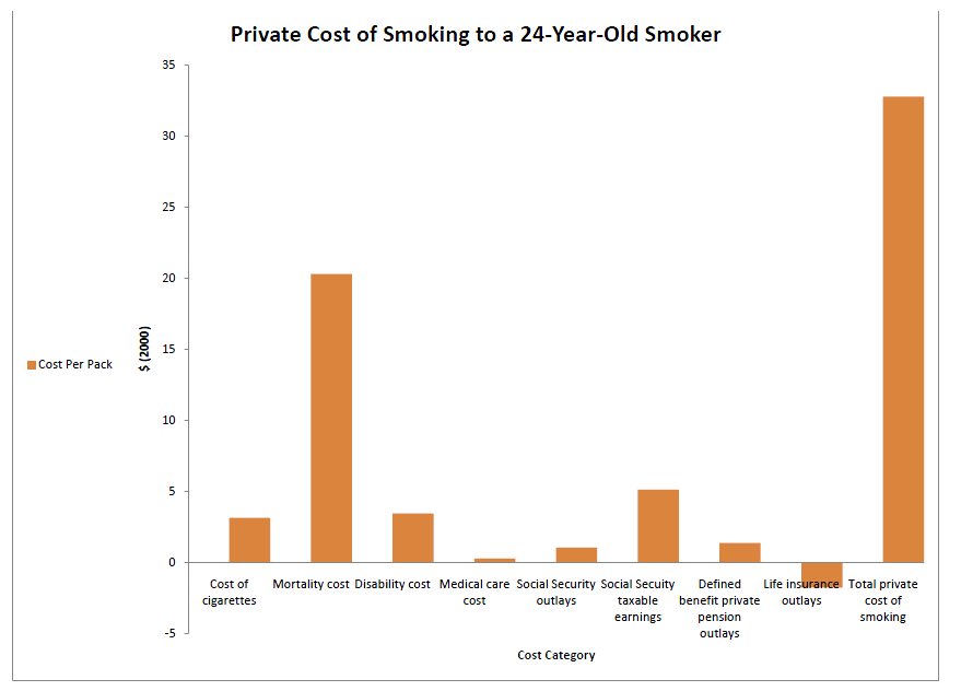 This post focuses on the private cost of smoking which we estimate to be around $33 dollars per pack, or approximately 80% of the social cost. Private costs–those costs due to smoking that are borne by smokers themselves–are by far the largest component of the social cost of smoking. We estimated costs using a life cycle approach that compared costs for 24 year old smokers to those of non smokers and attributed the differences to smoking (with some adjustments). Our method accounted for smoking cessation patterns and their influence on the social cost of smoking. All of the relationships estimated were based on large amounts of (mostly) longitudinal data. The methods will be described in a later methodological post.