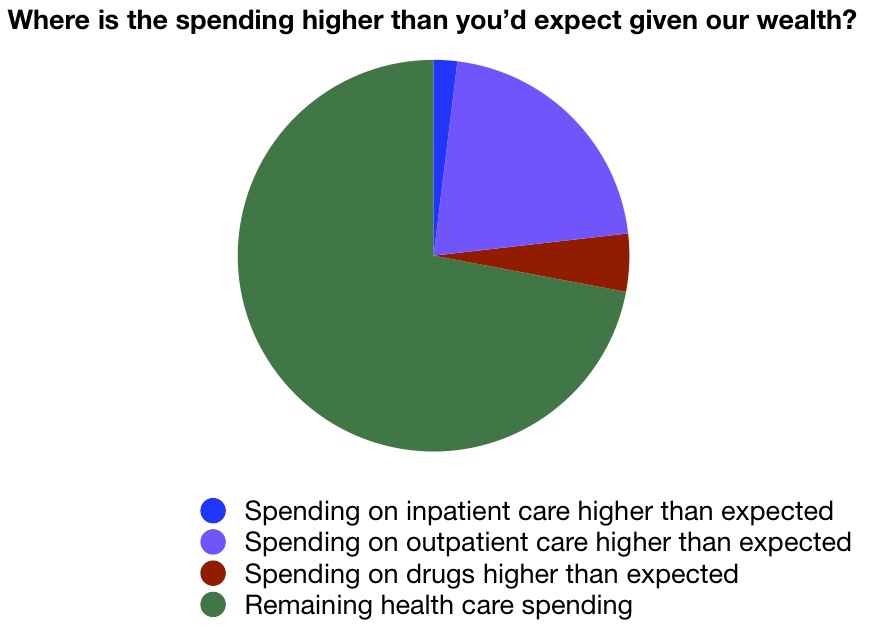 So to recap, although we actually take fewer drugs than people in other countries, we favor more expensive drugs, and we also pay more for the same drug. Add in the fact that we may be subsidizing R&D and that we also subsidize drug prices for the rest of the world, and there goes about $100 billion. This accounts for about 15% of our “extra” spending for health care.