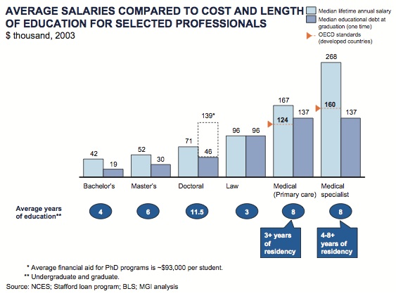 The bubbles underneath the x-axis show how many years various professions are in school/training. The dark shaded columns are the median educational debt at graduation. The light shaded bars are the median lifetime annual salaries. I don’t know how much higher the light shaded column should be than the dark shaded one. But you don’t hear lawyers complaining about this as much as you do doctors, and our light shaded bar is much higher than our dark shaded bar.