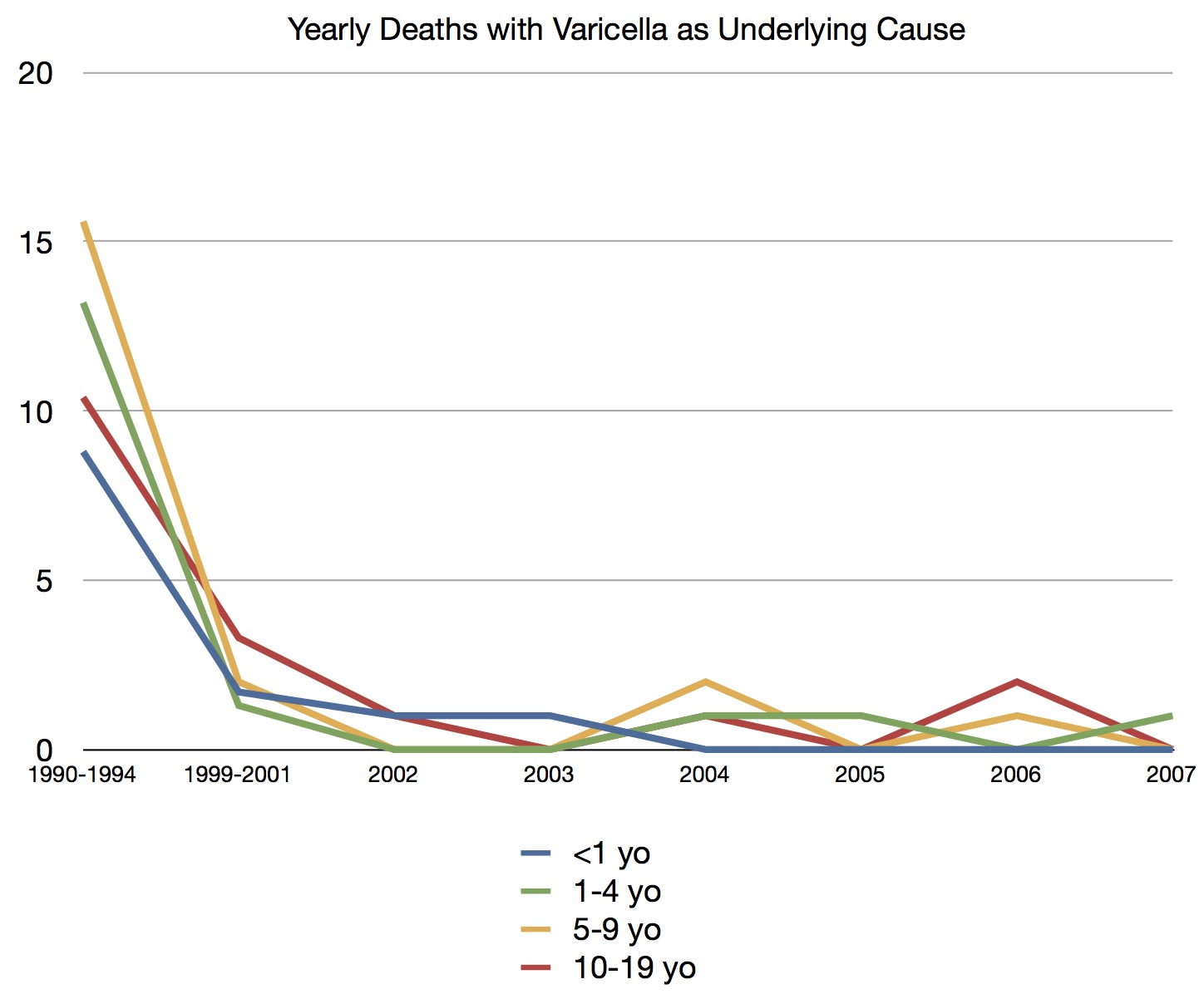 I made a chart from their data showing the number of deaths per year from varicella. Keep in mind that you’re seeing the average number of deaths per year when years are grouped, and that the vaccine went into play in the mid-1990’s: